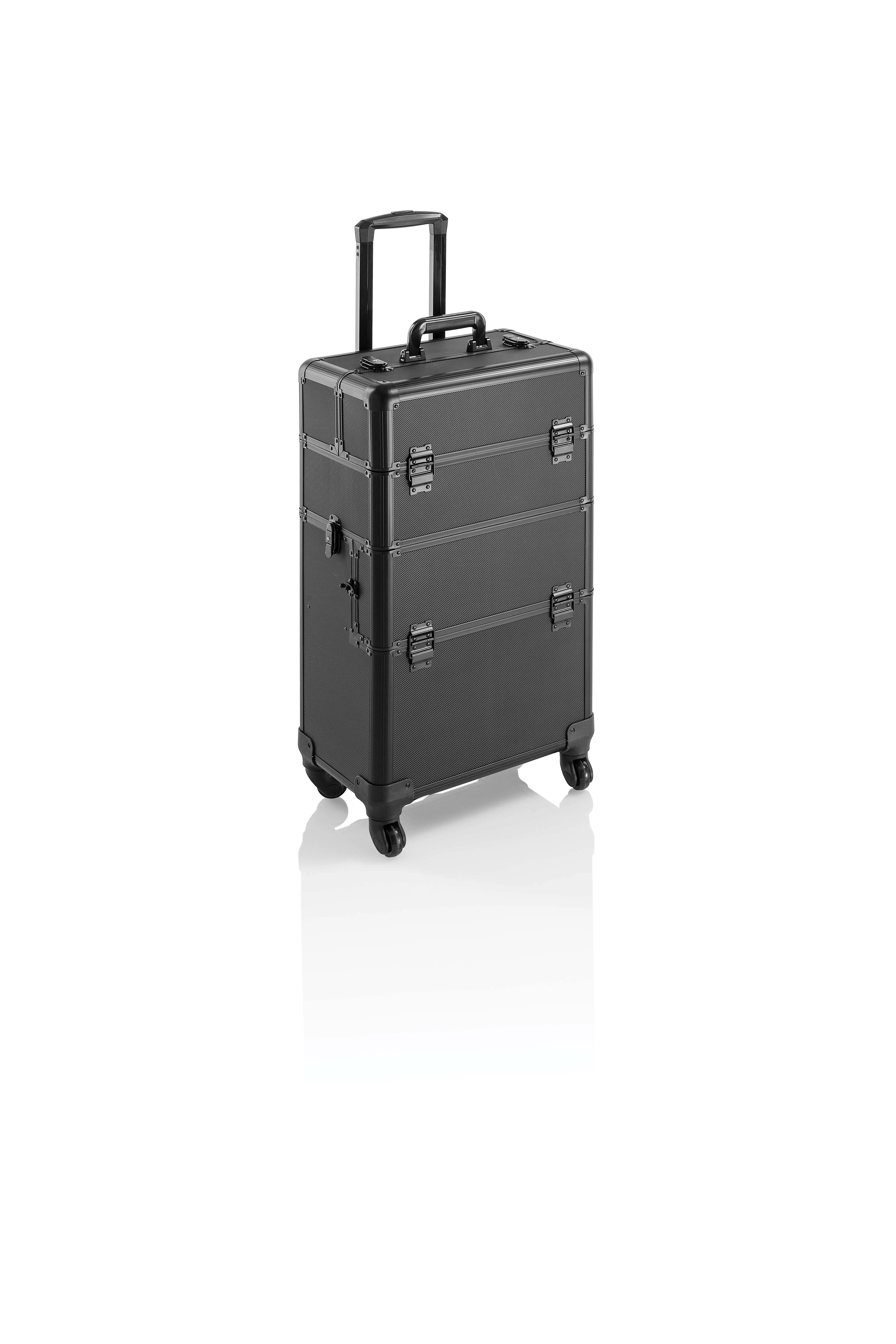 Hervorragende Schnappverschlüsse mit Schlüsselverriegelung und vier Rollen, die für einen komfortablen Transport des Trolleys auch mit leicht zerbrechlichen Geräten sorgen.