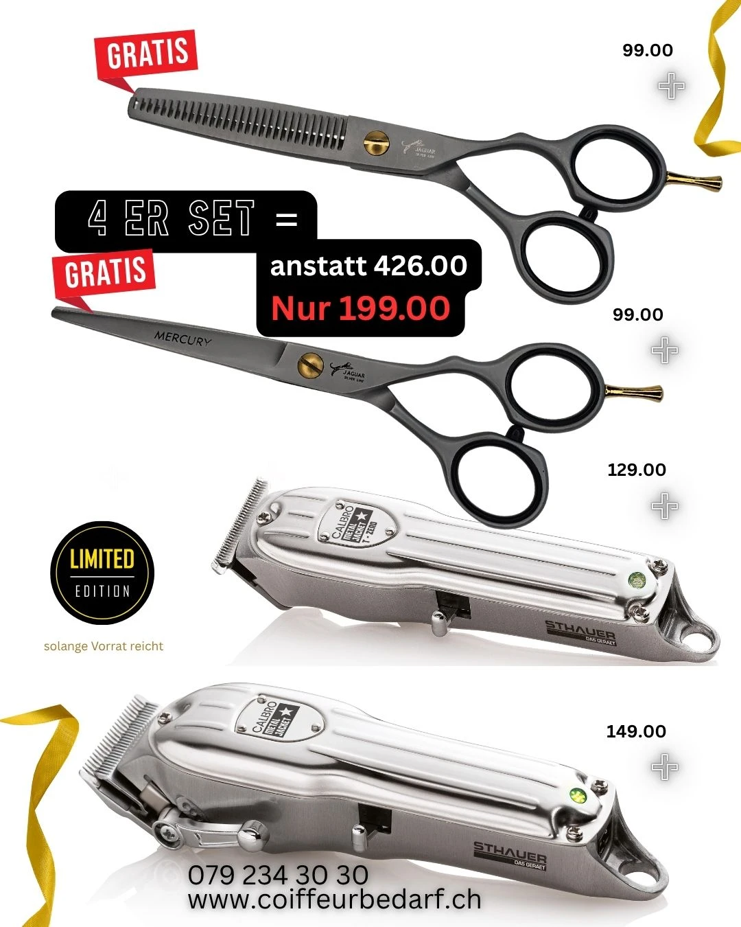 4er Profi-Set: JAGUAR x CALIBRO – Präzision in jeder Bewegung Dieses Set vereint zwei hochwertige Jaguar-Scheren mit zwei kompromisslosen CALIBRO Haarschneidern – für alle, die Performance, Ergonomie und Langlebigkeit erwarten.