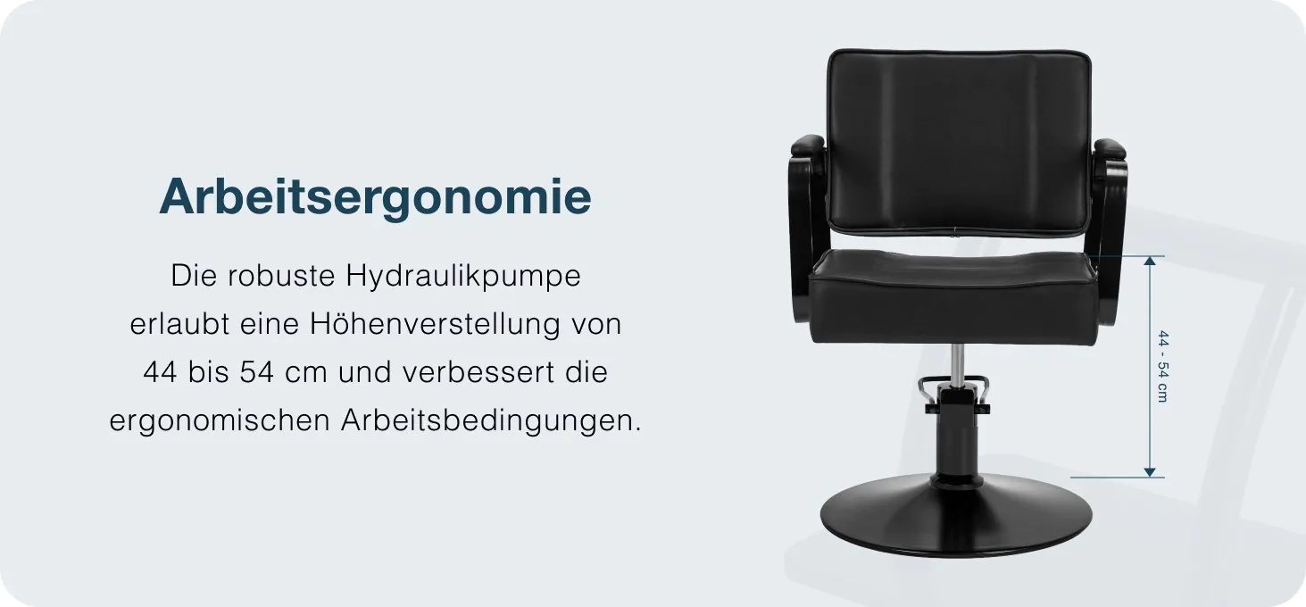 Arbeitsergonomie Der robuste hydraulische Hebelift ermöglicht es, die Sitzhöhe zwischen 44 und 54 cm einzustellen – selbst wenn der Kunde im Stuhl sitzt. Dies erleichtert ergonomische Arbeit und ermöglicht es dem Friseur, die Höhe an seine Bedürfnisse und die Körpergröße des Kunden anzupassen. Die profilierte Rückenlehne sorgt für stabile Rückenstütze, was besonders für längere Behandlungen wichtig ist. Seine Form ermöglicht freien Zugang zu Hals, Nacken und Haaransatz und unterstützt präzises Schneiden, Styling und Färben.