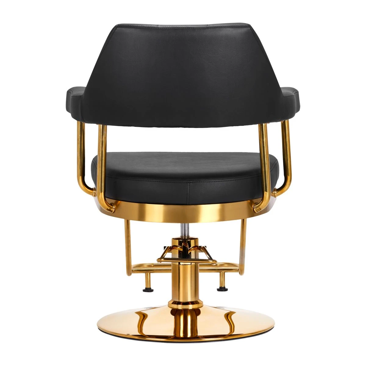 Der Sessel ist mit Schaumstoff gefüllt, der langlebig ist und sich nicht verformt , was eine bequeme Nutzung über einen langen Zeitraum gewährleistet. Die Polsterung besteht aus Kunstleder mit angenehmer Haptik und spezifischer Struktur. Dank der Verwendung dieses Materials ist das Gerät feuchtigkeitsbeständig, langlebig und leicht zu reinigen . Bespannungen in Schwarztönen und dekorative goldfarben lackierte Metalloberflächen verleihen ihr einen Ausdruck zeitloser Eleganz . Es zeichnet sich durch eine geschmackvolle Verarbeitung aus, die ihm einen exklusiven Charakter verleiht und es in vielen professionellen Salons gut aussehen lässt.