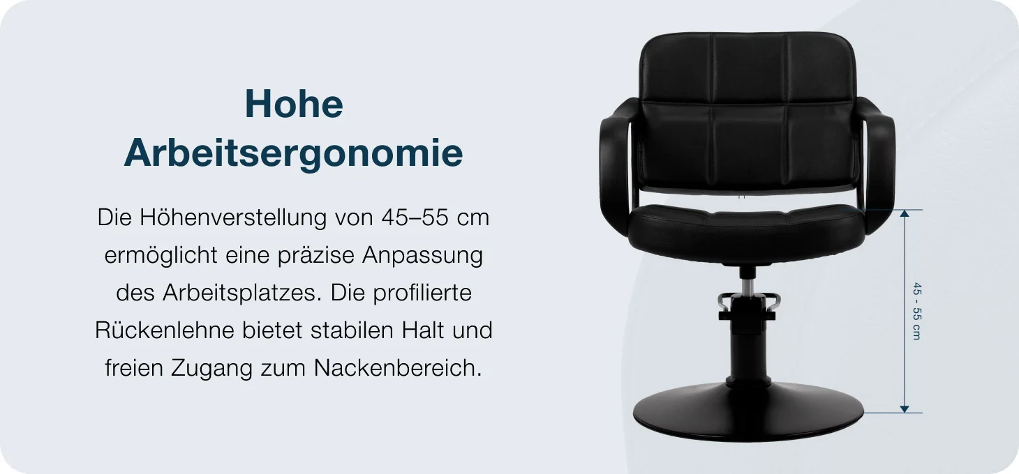 Friseurstuhl Kamrad – Ergonomie & Präzision im Salonalltag Ergonomie am Arbeitsplatz Der Friseurstuhl Kamrad wurde für maximalen Komfort und effizientes Arbeiten entwickelt. Der robuste Hydraulikheber ermöglicht eine stufenlose Höhenverstellung von 45–55 cm – sogar während der Behandlung. So lässt sich die Sitzposition ideal an die Körpergröße des Kunden und die Arbeitsweise des Friseurs anpassen.