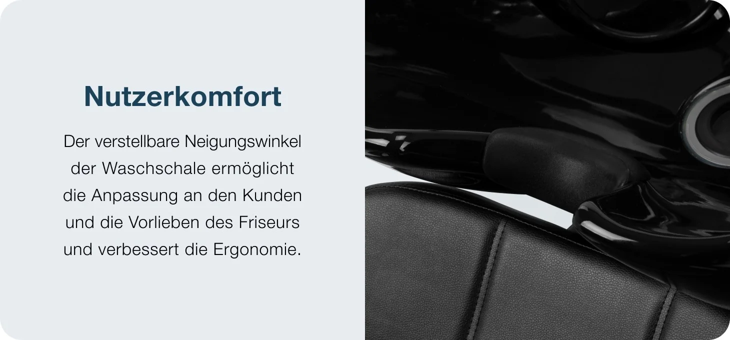 Der verstellbare Neigungswinkel ermöglicht eine optimale Anpassung an die Körpergröße des Kunden und die Arbeitsweise des Friseurs – ideal für ergonomisches Arbeiten.