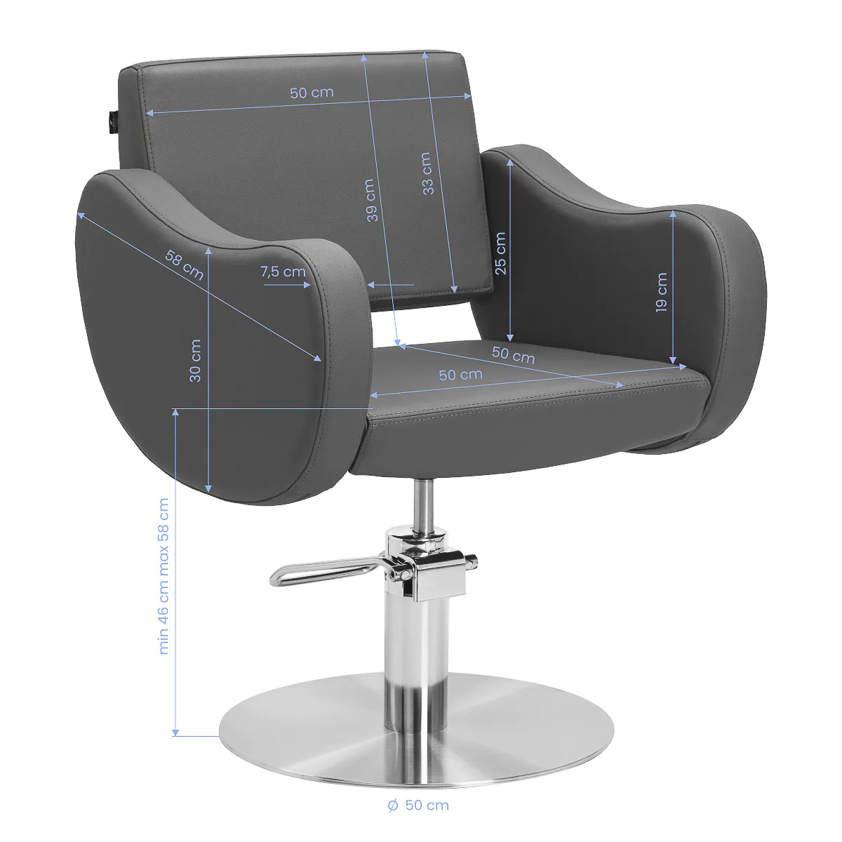 Durch den robusten hydraulischen Lift lässt sich die Sitzhöhe stufenlos von 46 bis 58 cm verstellen – auch wenn der Kunde auf dem Sitz sitzt. Diese praktische Lösung ermöglicht es Ihnen, die Position einfach an die Körpergröße sowohl des Kunden als auch des Stylisten anzupassen und so das ergonomische Arbeiten zu unterstützen. Die profilierte Rückenlehne sorgt für eine bequeme Position und eine stabile Rückenstütze, was besonders bei längeren Behandlungen wichtig ist. Ein weiterer Vorteil ist der Volldrehmechanismus, der die Bewegungsfreiheit erhöht und den Zugang zum Kunden von allen Seiten erleichtert.