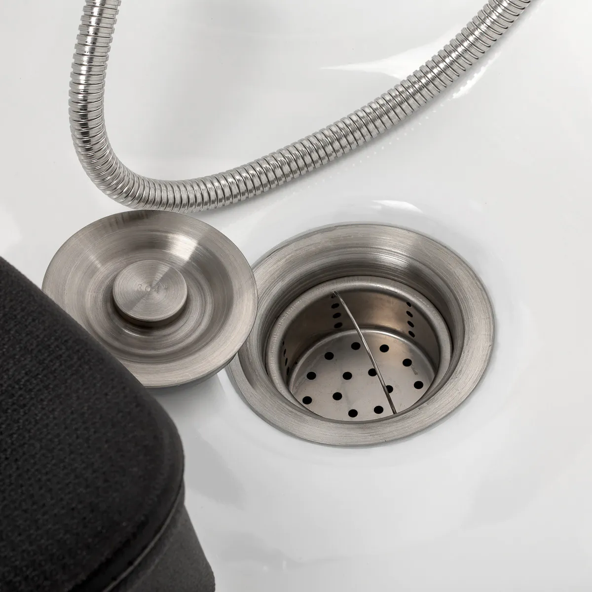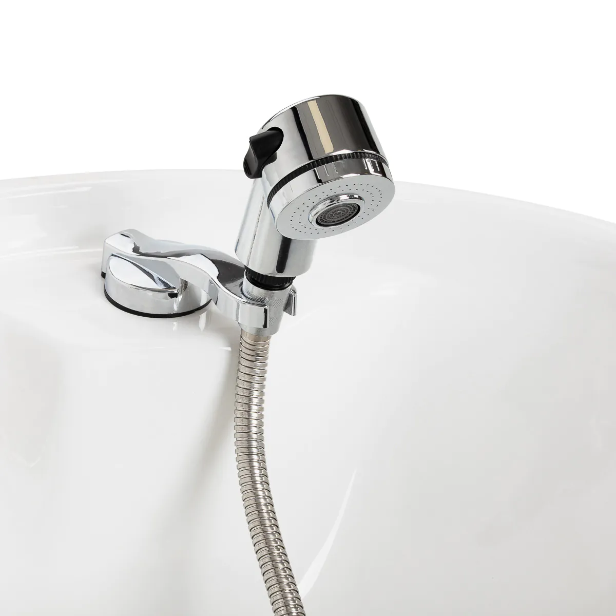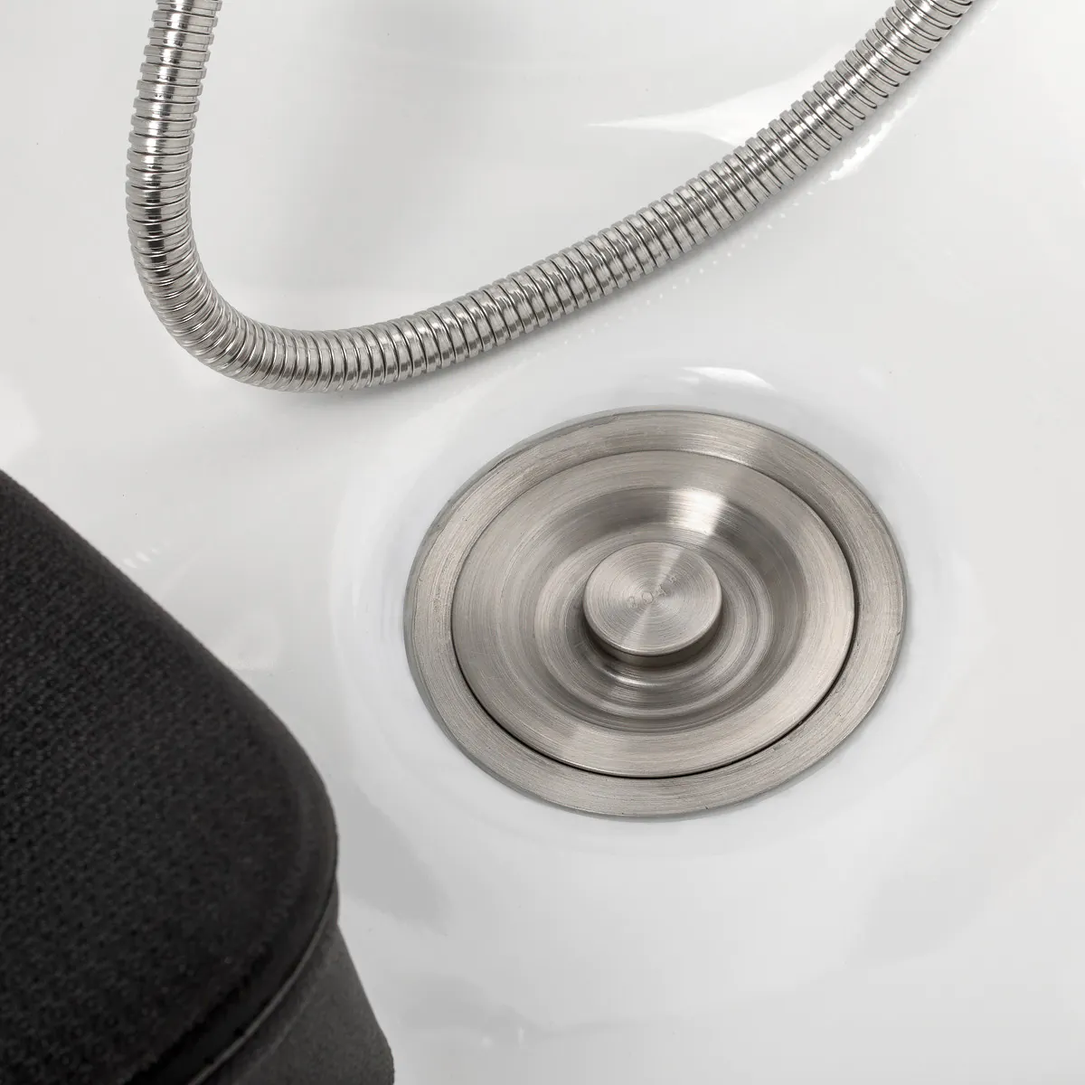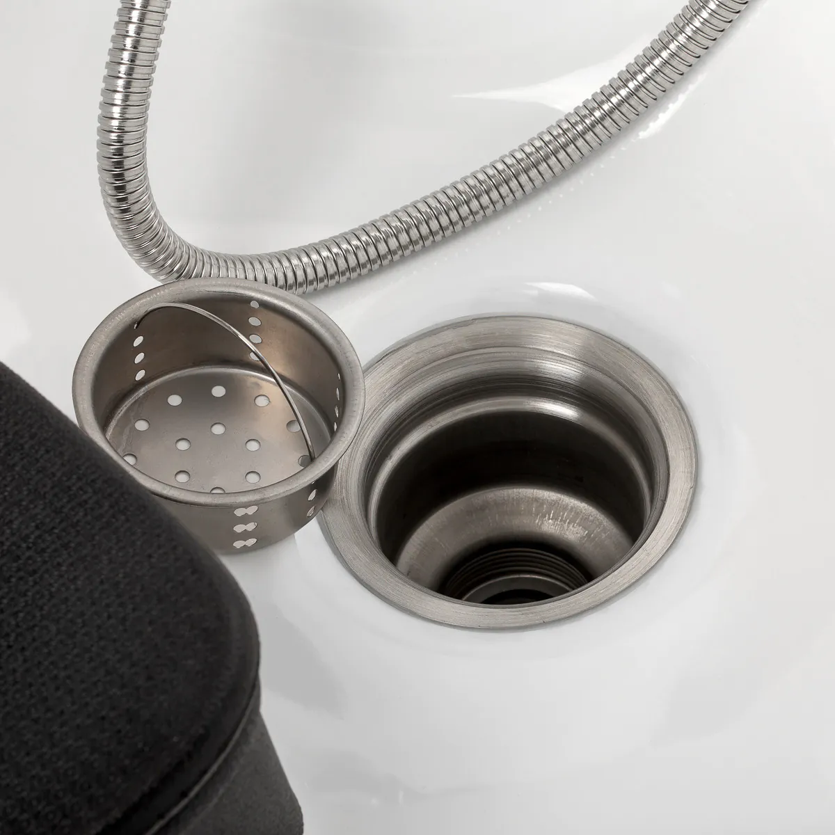 Eine Ablage für den Duschkopf sorgt für Ordnung am Arbeitsplatz, während der Stopfen mit integriertem Sieb den Wasserfluss reguliert und zur Hygiene beiträgt.