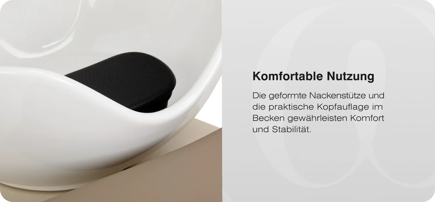 Der geformte Rand bietet eine stabile Kopfstütze, während die integrierte Kopfauflage eine angenehme Position während der Haarwäsche ermöglicht. Eine Silikonauflage mindert das Kältegefühl und erhöht den Komfort zusätzlich.