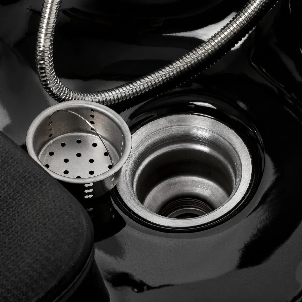 Eine Ablage für den Duschkopf sorgt für Ordnung am Arbeitsplatz, während der Stopfen mit integriertem Sieb den Wasserfluss reguliert und zur Hygiene beiträgt.