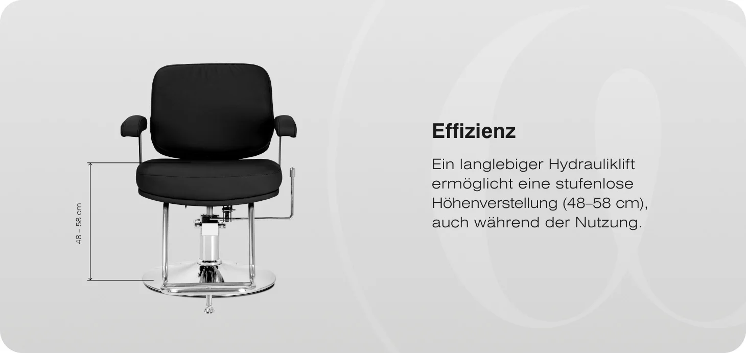 Der robuste hydraulische Hubmechanismus ermöglicht eine stufenlose Höhenverstellung des Sitzes von 48 bis 58 cm, auch während der Nutzung. Dadurch lässt sich die Arbeitsposition ergonomisch an die Körpergröße von Kunde und Stylist anpassen — für mehr Komfort und Effizienz im Salonalltag.