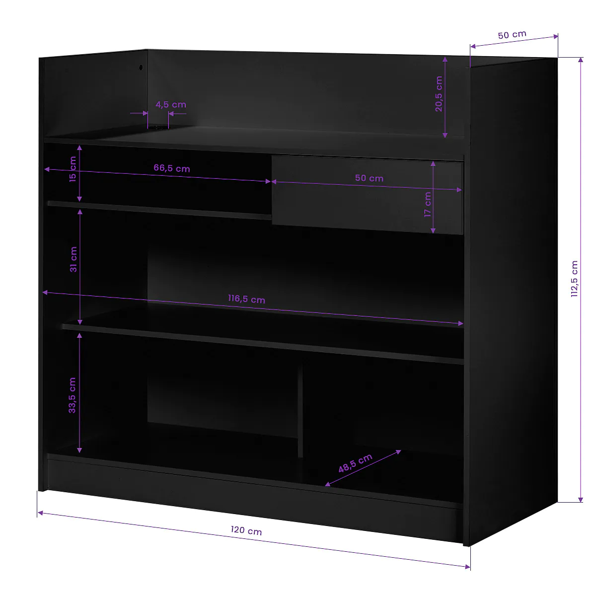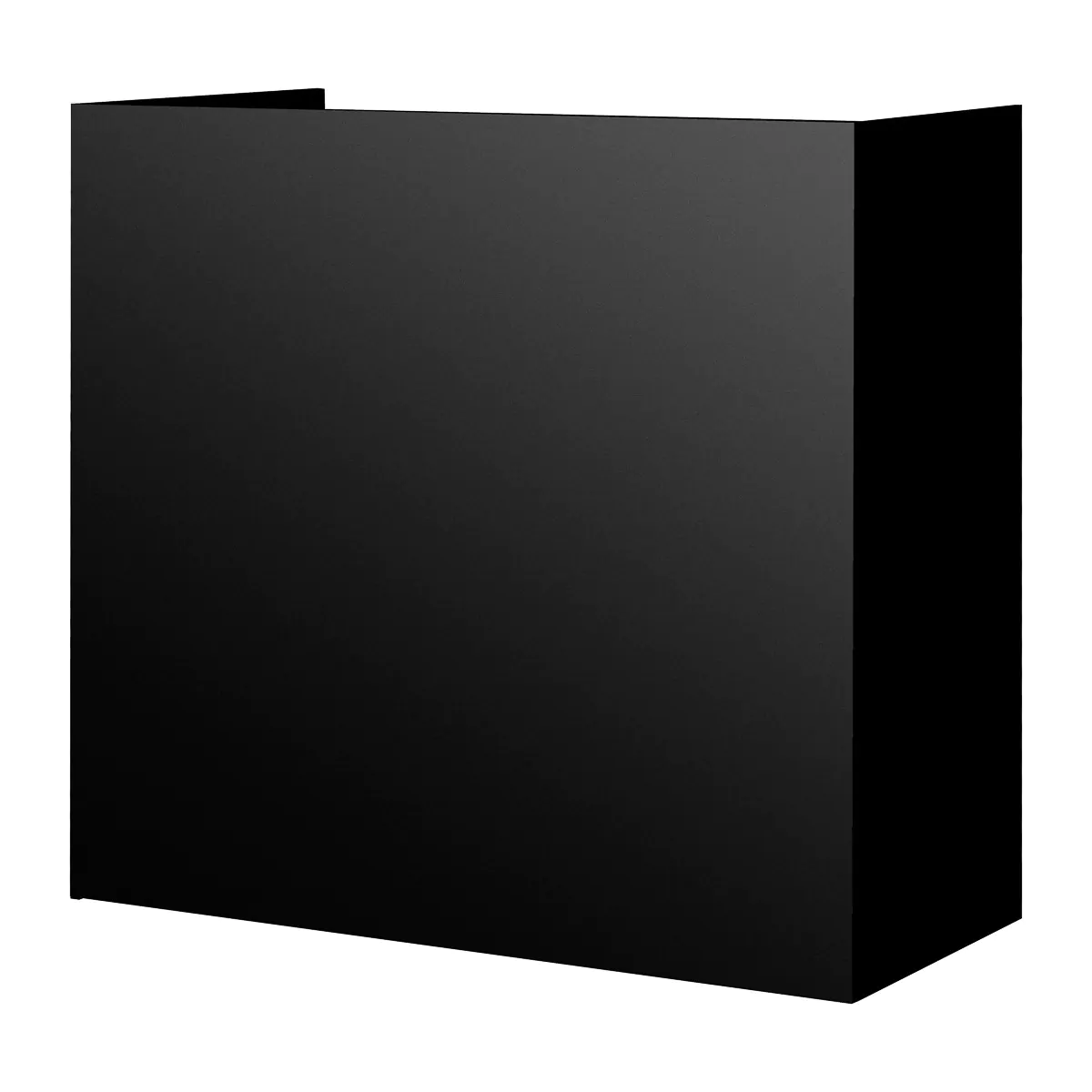 Minimalistisches Design Das Möbelstück besteht aus hochwertiger, strapazierfähiger Laminatplatte in Schwarztönen, und die glatten Oberflächen sind pflegeleicht. Die einfache Konstruktion und das minimalistische Design verleihen der Empfangstheke einen zeitlosen Charakter, der sich nahtlos in unterschiedliche Einrichtungsstile einfügt. Die Theke ist sorgfältig verarbeitet, stabil und aus langlebigen Materialien gefertigt, die eine jahrelange Nutzung ermöglichen.