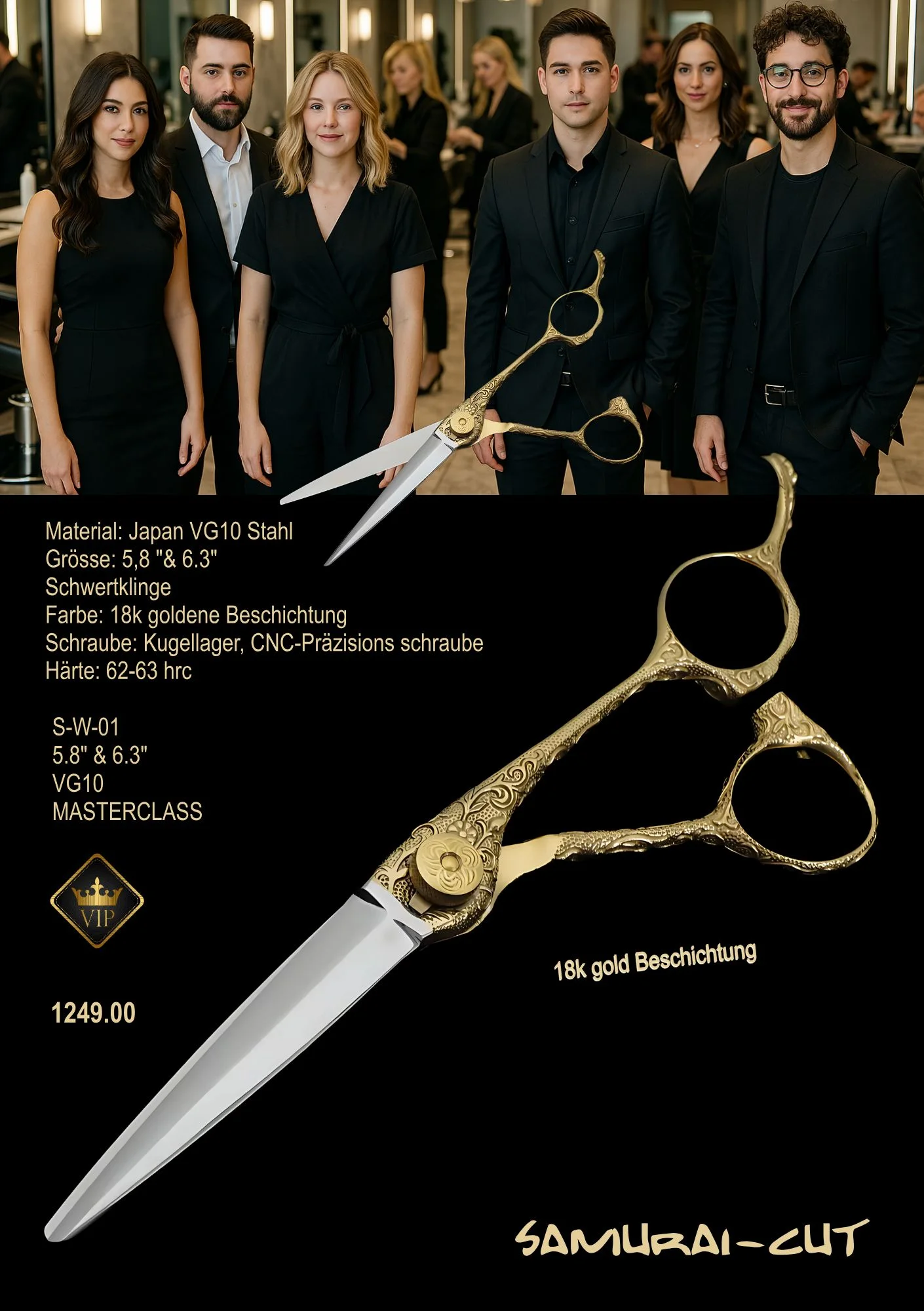 Erleben Sie die ultimative Präzision und Eleganz mit der Meisterklasse-Haarschere von Samurai Cut. Gefertigt aus hochwertigem JapanVG10 Stahl, bietet diese Schere eine außergewöhnliche Härte von 62-63 HRC, die für langanhaltende Schärfe sorgt. Die Schwertklinge ist in zwei Größen erhältlich: 5,8" und 6,3", perfekt für verschiedene Schneidetechniken.