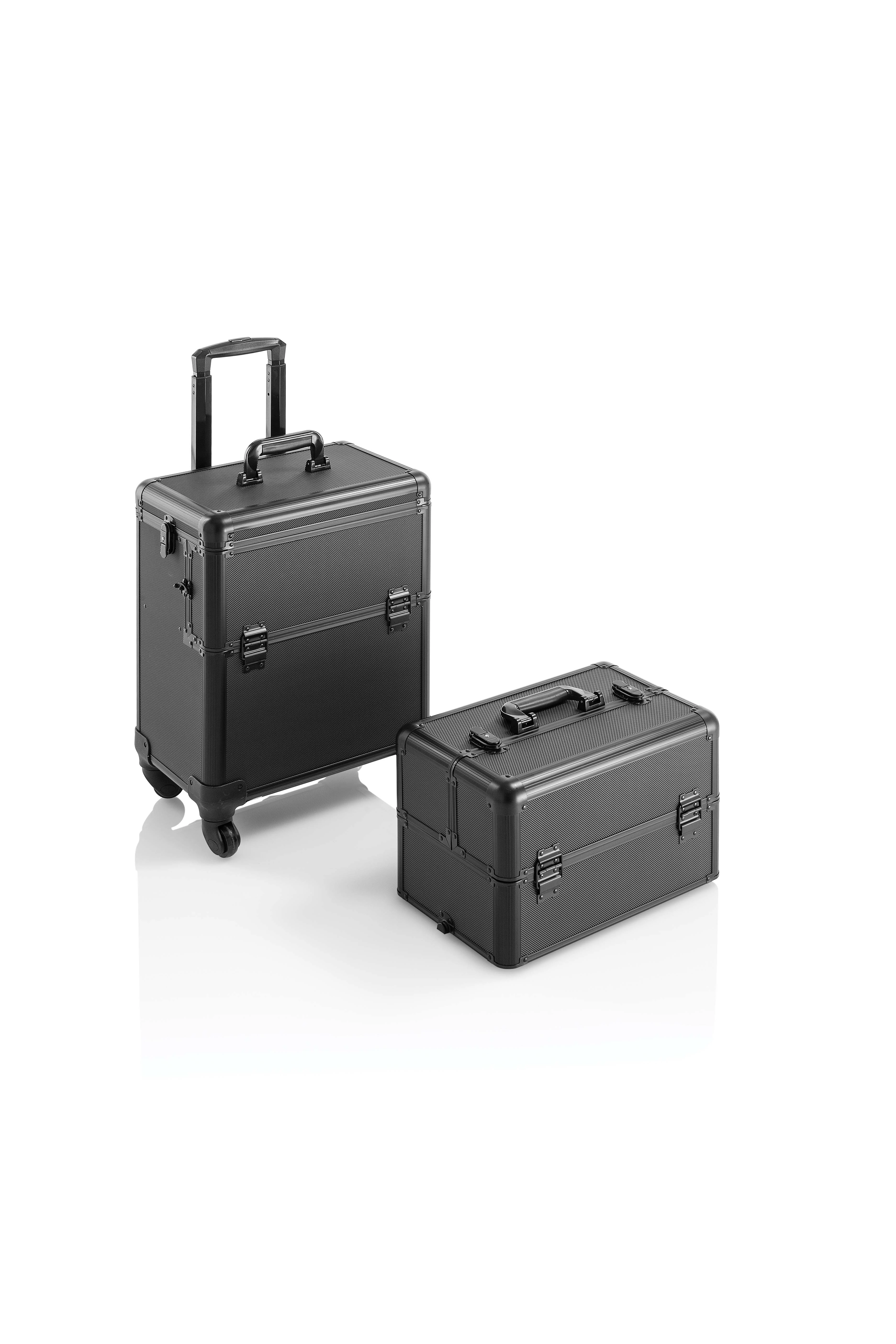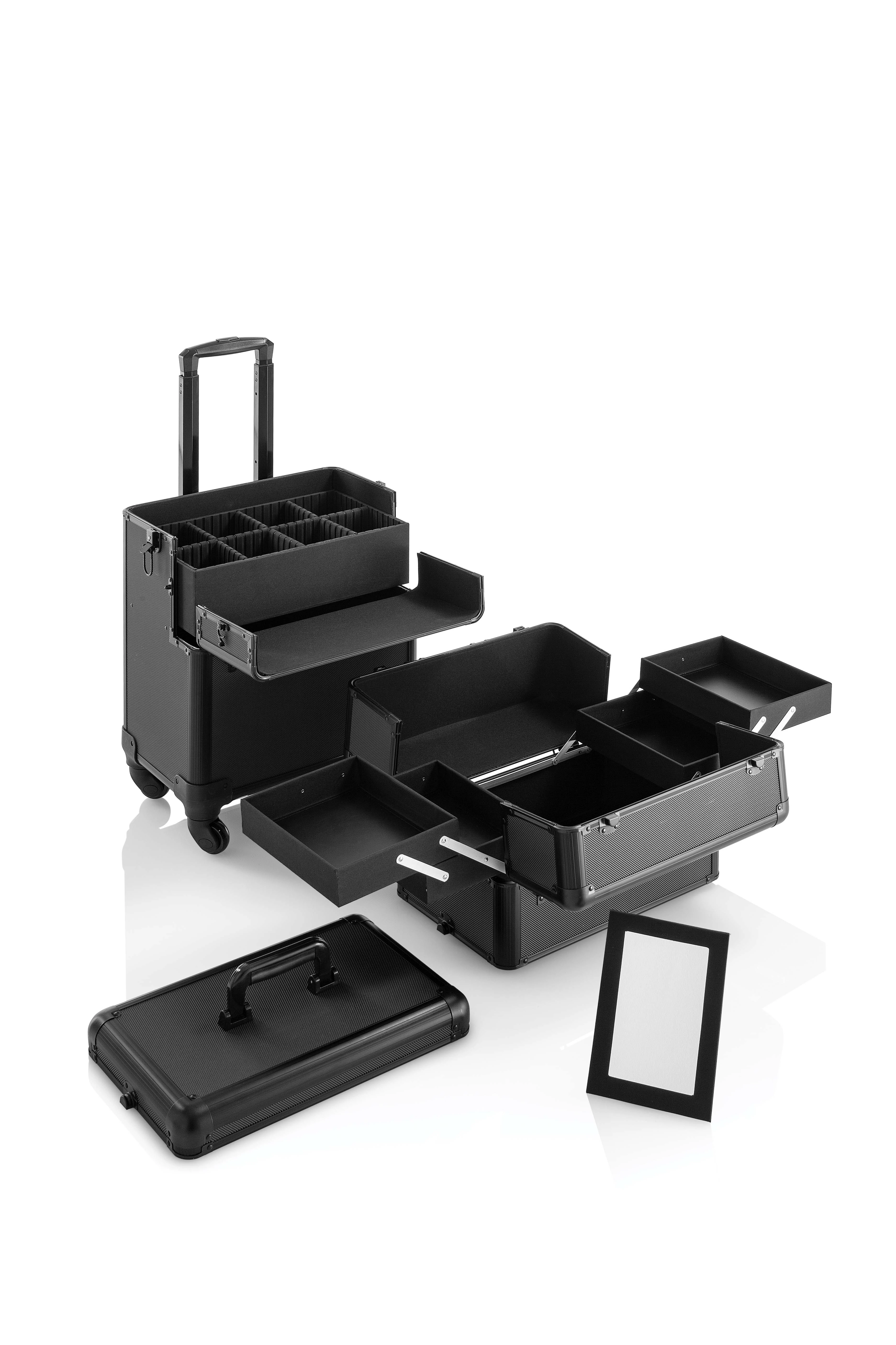 Hervorragende Schnappverschlüsse mit Schlüsselverriegelung und vier Rollen, die für einen komfortablen Transport des Trolleys auch mit leicht zerbrechlichen Geräten sorgen.