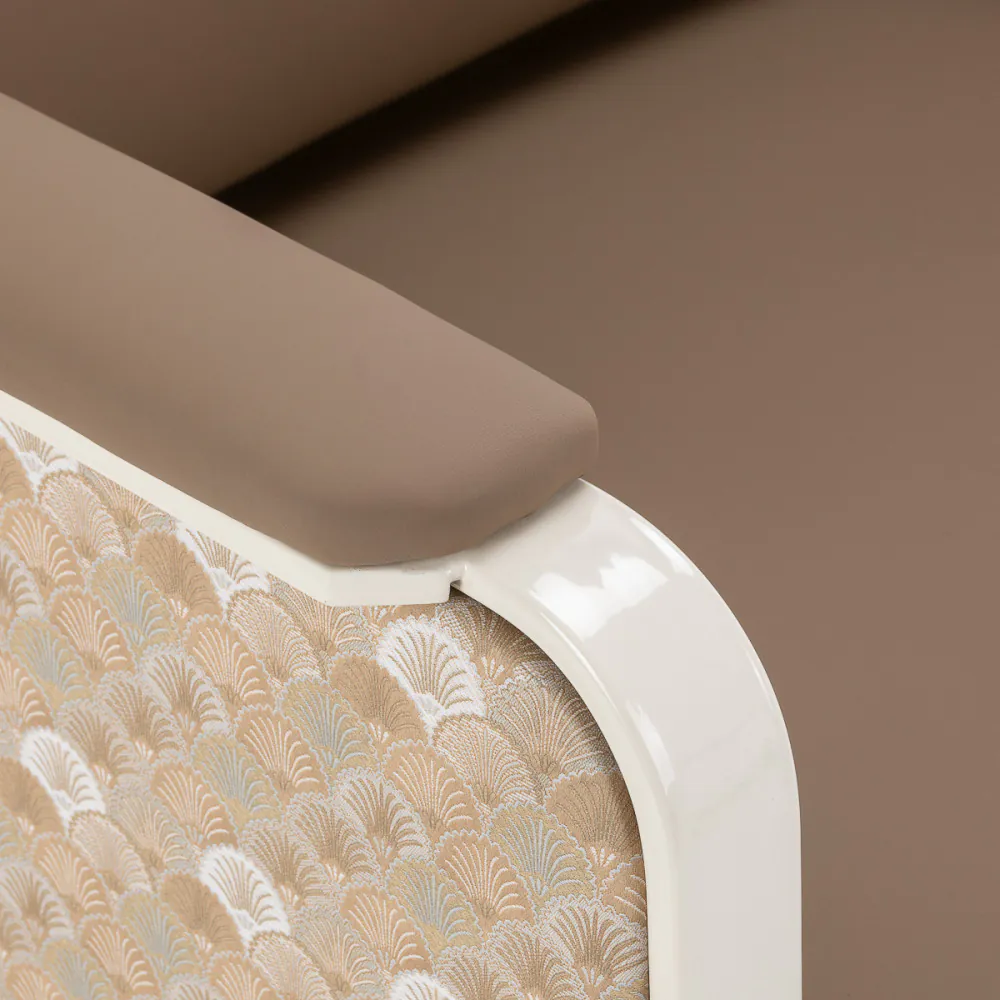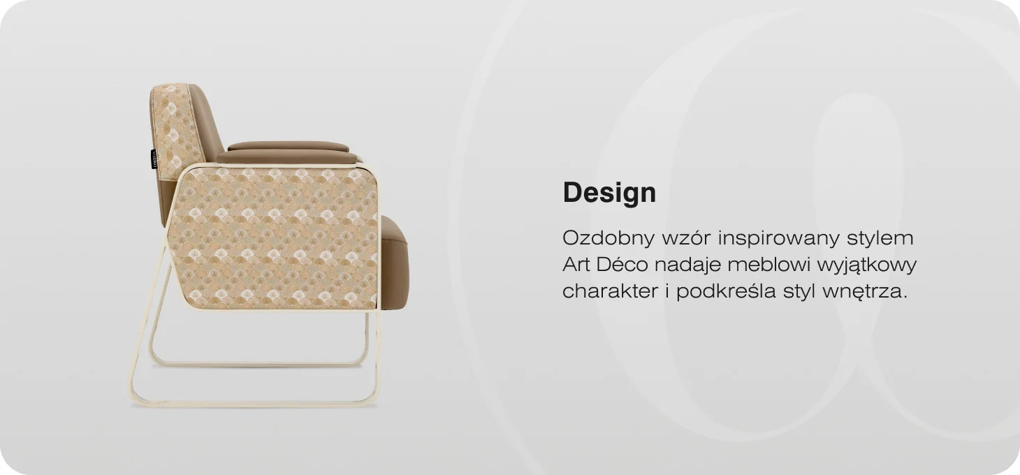 Feuchtigkeitsbeständig & pflegeleicht Langlebiges Bezugsmaterial für intensiven Salonbetrieb Stabile Metallkonstruktion in hellem Ton für sicheren Stand Das vom Art‑Déco inspirierten Muster auf der Außenseite verleiht dem Sessel einen einzigartigen Charakter und setzt einen stilvollen Akzent im Raum.