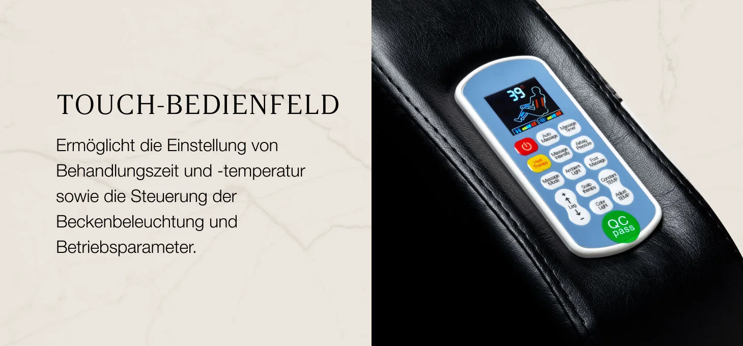 Wassertemperatur 30–50 °C Aktivierung der Lichttherapie Massageintensität in 3 Stufen Rückenheizung Massagedauer: 10, 15, 20 oder 40 Minuten Luftkissen‑Druckmassage in 3 Stufen Alle Parameter lassen sich präzise an die Bedürfnisse des Kunden anpassen.
